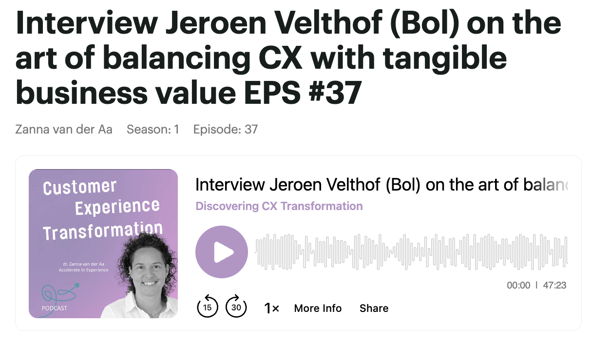 Today, I want to talk about a few key insights from my recent podcast with Jeroen Veltkamp, a fellow CX leader from bol.com, the Netherlands’ biggest e-commerce retailer with over 40 million customers. He shared with us not just his CX journey but also some very actionable tips on how to turn customer-centricity into a measurable impact for the business. And yes, we even got into the much-debated Net Promoter Score (NPS)!